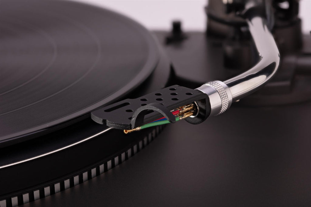 A practical notch at the front of the headshell helps guide the stylus safely onto the record surface, improving handling during cueing. High-quality, colour-coded connection leads with gold-plated contacts ensure clean, low-loss signal transmission. A rubber washer is included to guarantee a firm and stable connection between the headshell and the tonearm, reducing unwanted vibration at the interface.