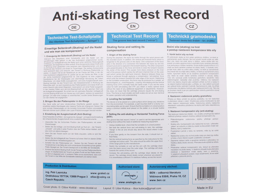 This groove-free test record is designed for accurate anti-skating adjustment on turntables. By using a smooth vinyl surface without grooves, it allows clear observation of tonearm behaviour, making it easier to set the correct anti-skating force on your record player.